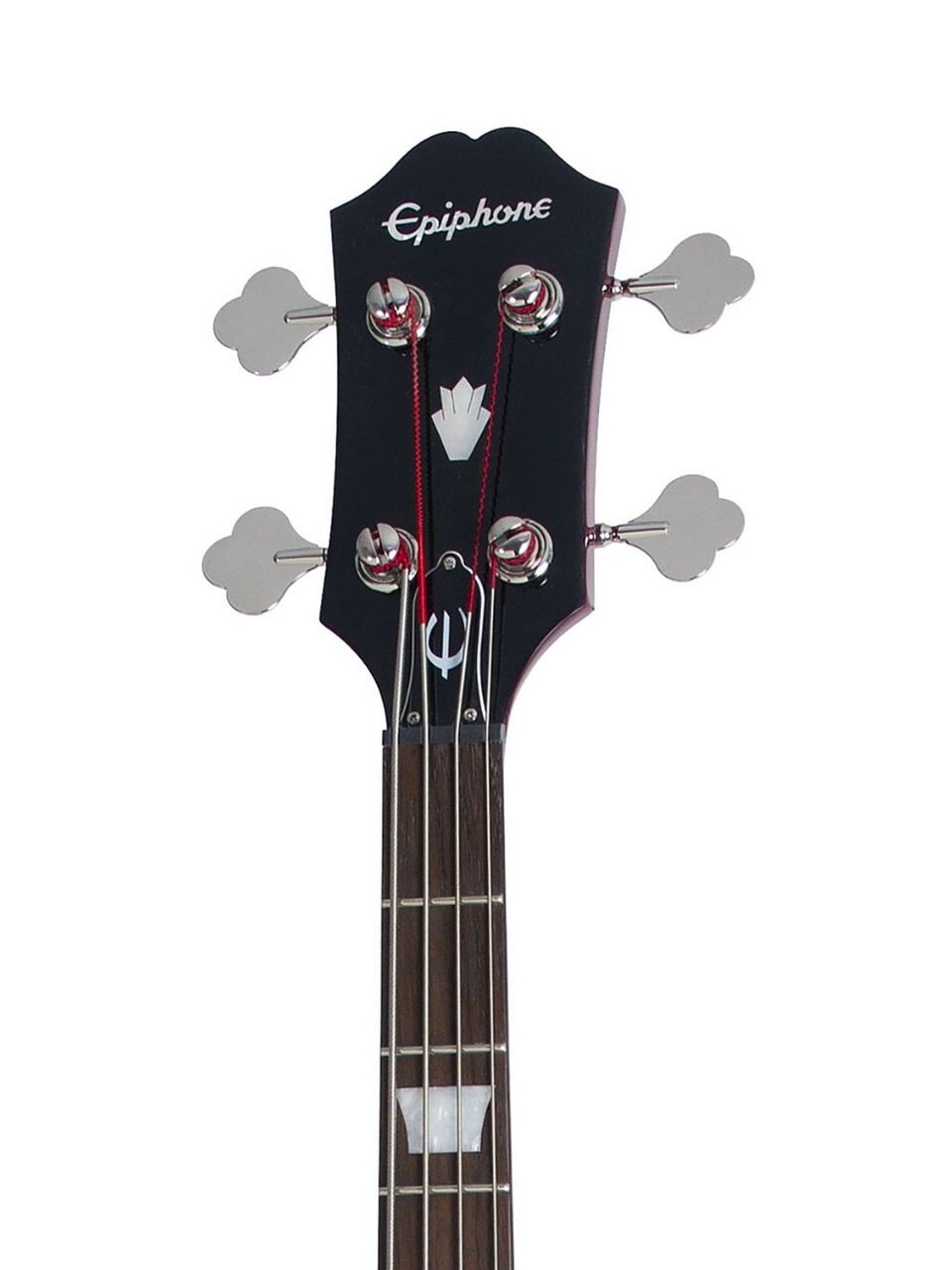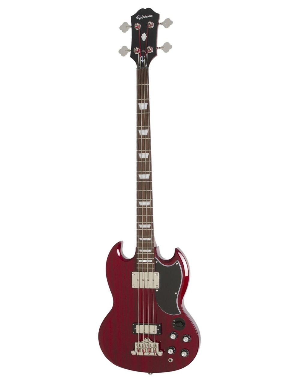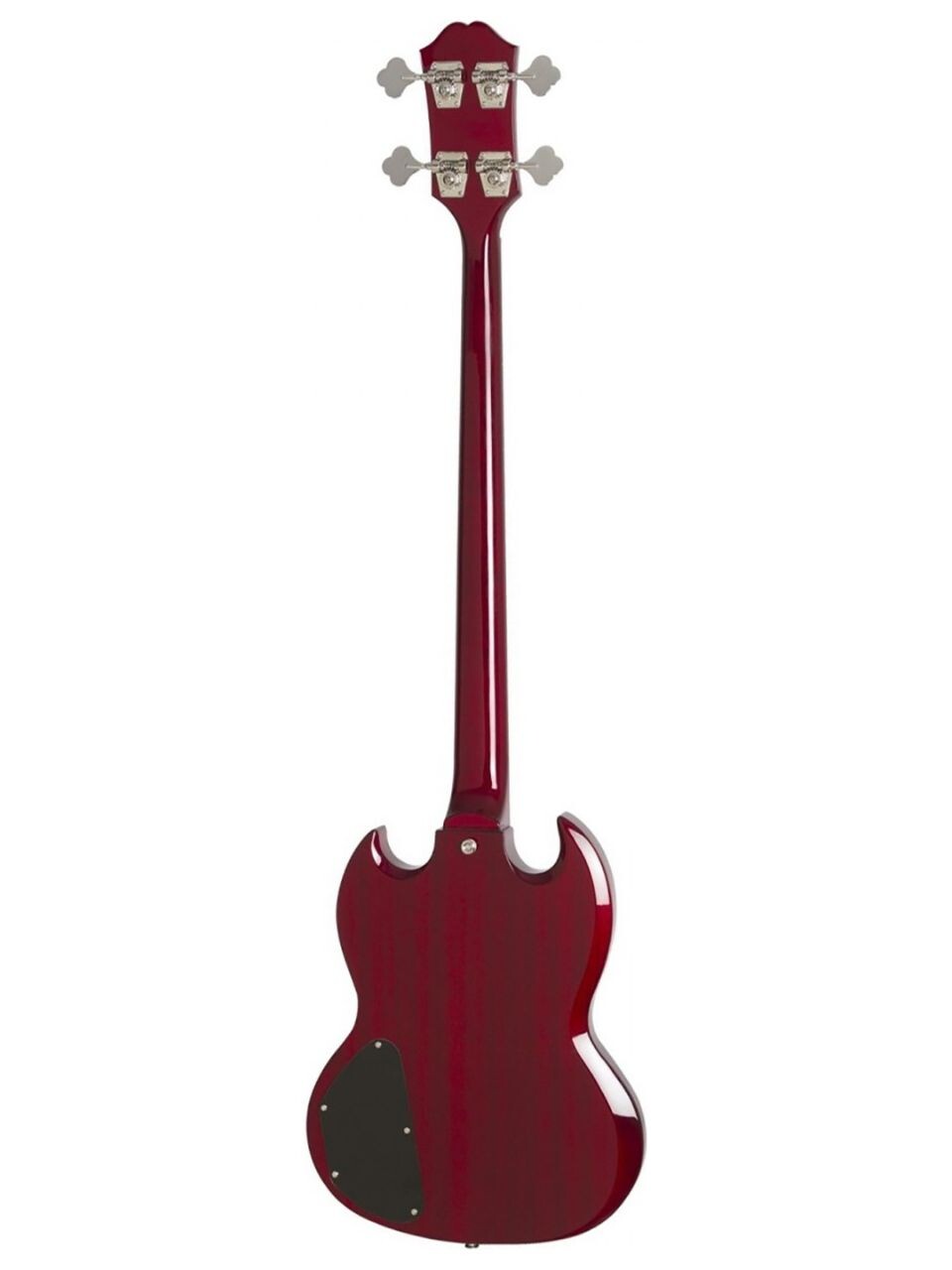 Bajo eléctrico de 4 cuerdas, Epiphone SG Bass EB3, cuerpo de caoba, terminado al alto brillo, brazo de caoba, perfil SlimTaper “D”, longitud de escala: 34″, diapasón de pau ferro, 20 trastes, cejuela de plástico de 1.65″ de ancho, incrustaciones de trapezoide, unión Set In, hardware niquelado, afinadores niquelados, puente ajustable, mica negra, 2 botones de tahalí, pastilla del puente: NYT Bass Mini Humbucker, pastilla del brazo: Sidewinder Humbucker, controles: 2 volúmenes y 2 tonos, clavijeros: estilo clásico premium, jack de salida de 1/4″.