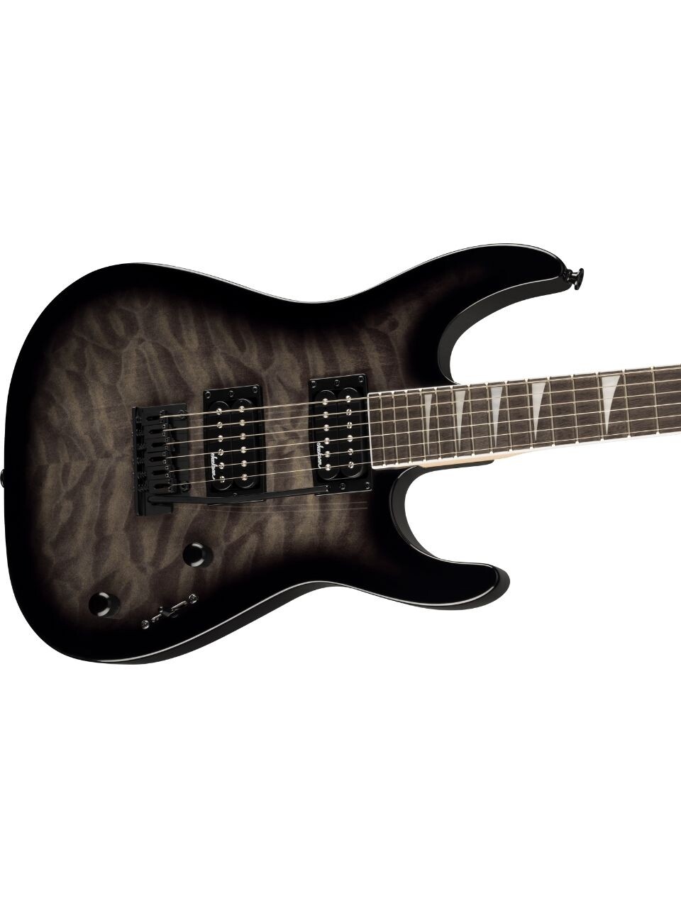 La JS Series Dinky® JS20 DKAQ 2PT tiene un cuerpo de álamo con tapa de arce acolchado, mástil atornillado de arce con refuerzo de grafito y un diapasón de amaranto con radio compuesto de 12«-16» con 24 trastes jumbo e incrustaciones de perloide en forma de aleta de tiburón.