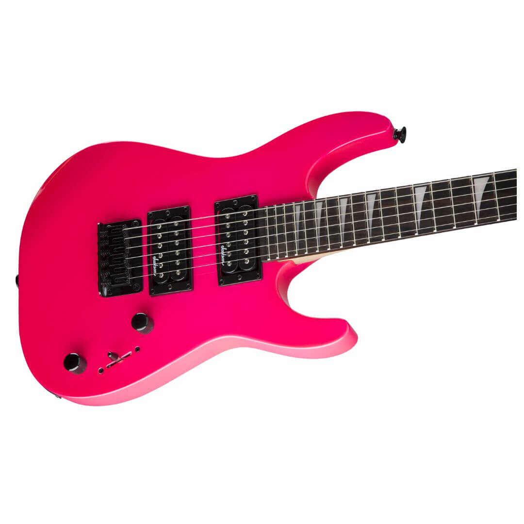 Con una longitud de escala de 2/3 (22,5«), la Dinky Minion JS1X cuenta con un cuerpo de álamo, un mástil de maple atornillado con varillas de refuerzo de grafito y un diapasón de amaranto con un radio de 12» con 24 trastes jumbo e incrustaciones de aleta de tiburón. El clavijero Jackson en ángulo trasero con 6 clavijas en línea permite distribuir la tensión de manera uniforme, mientras que el talón esculpido facilita la ejecución de los trastes superiores.