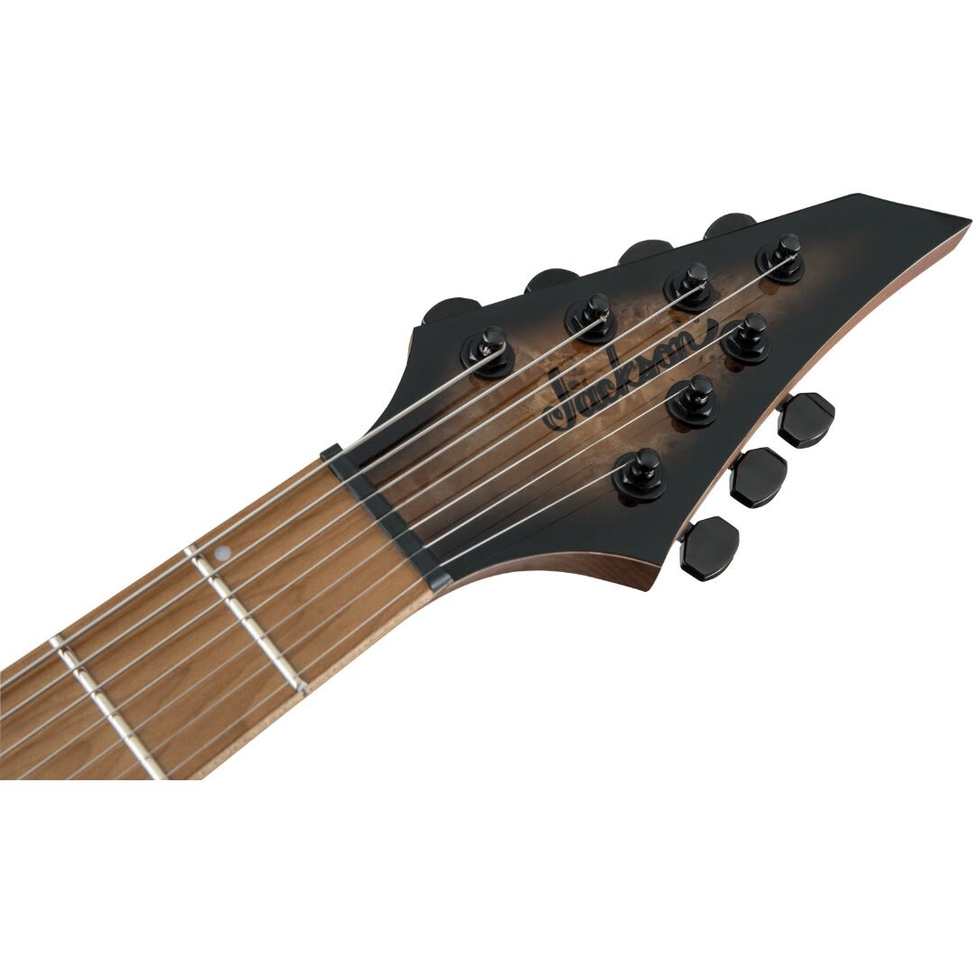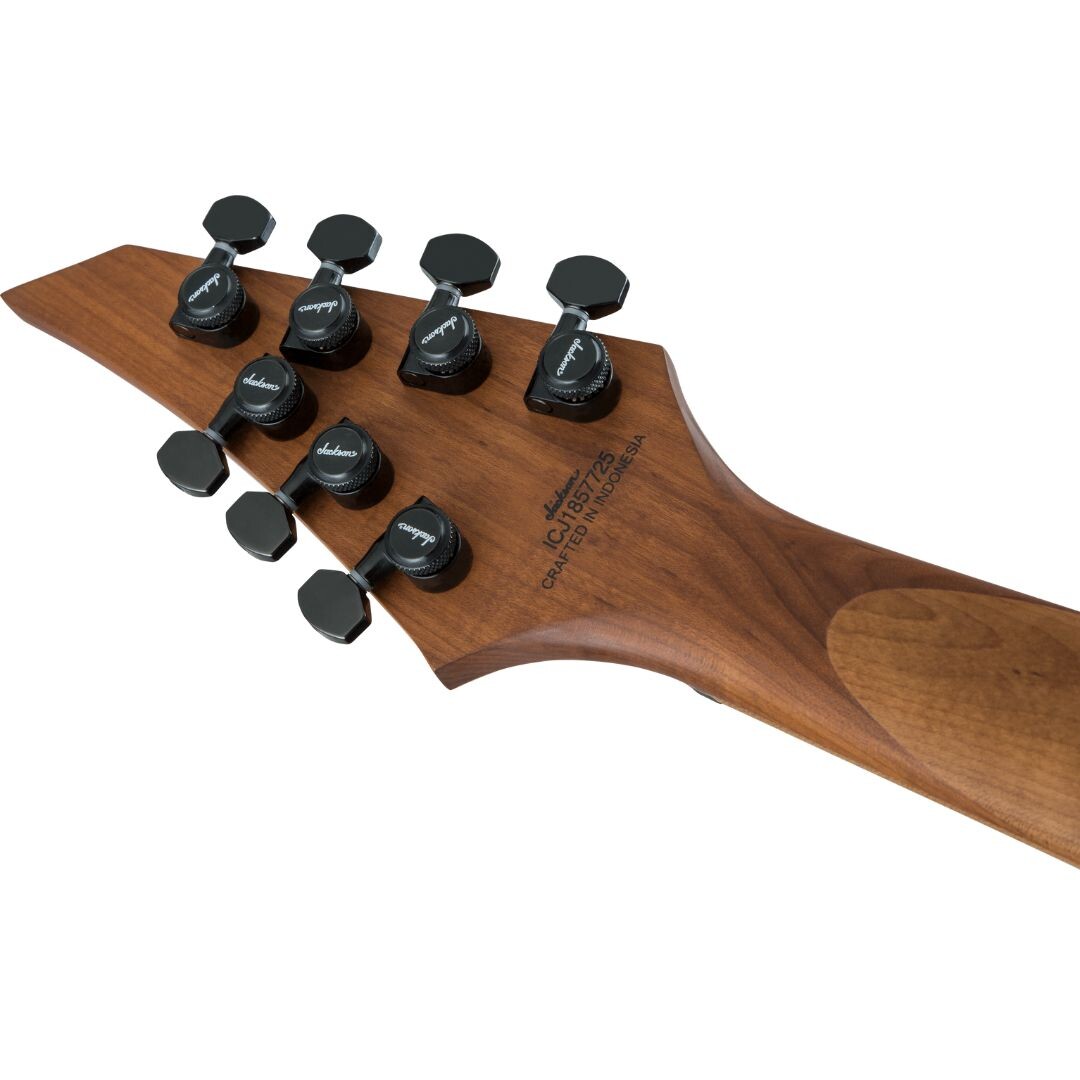 Este gigante de 7 cuerdas está disponible en un nuevo y sofisticado acabado Chlorine Burst Burl con un clavijero Jackson 4×3 AT-1 a juego y herrajes negros.