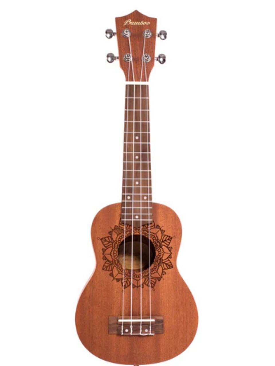 Una fusión de belleza y calidad sonora, con su grabado de un mandala sobre la madera de caoba, este ukelele te invita a sumergirte en los detalles y apreciar las cosas pequeñas y hermosas de la vida. Cada símbolo grabado representa nuestra conexión con la Tierra y nos brinda la oportunidad de expresarnos de manera única.